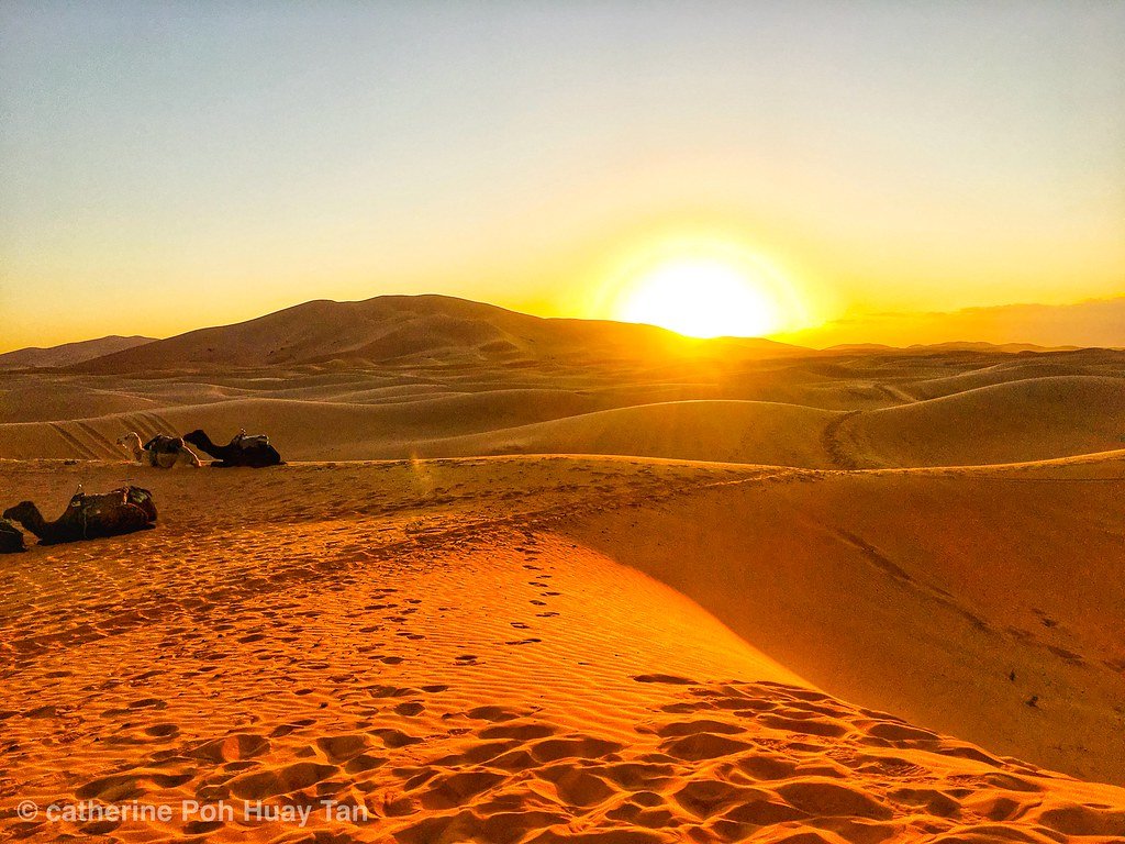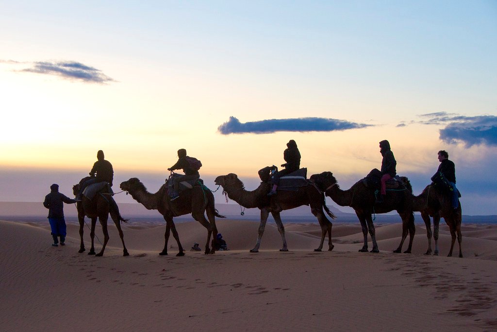 Aquí te esperarán los camellos para adentrarte en las dunas doradas de Erg Chebbi. Mientras el sol desciende lentamente, los tonos del desierto cambian del dorado al rojo intenso. Al llegar al campamento de lujo, serás recibido con el tradicional té a la menta. La noche será mágica: una cena bereber bajo las estrellas y música tradicional alrededor del fuego. Dormirás en una tienda privada, arropado por el silencio del desierto.
