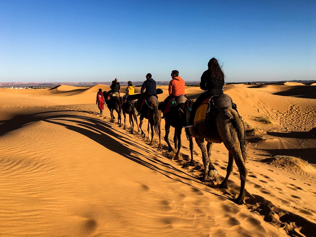 Continuaremos hacia Errachidia y el Valle del Ziz, un impresionante corredor verde de palmeras que serpentea entre montañas de color ocre. Llegaremos al desierto de Merzouga al atardecer, donde los dromedarios nos esperarán para iniciar una inolvidable excursión por las dunas de Erg Chebbi. Disfrutaremos del atardecer en el desierto y pasaremos la noche en un campamento bereber tradicional con cena, música y fuego bajo un cielo estrellado.